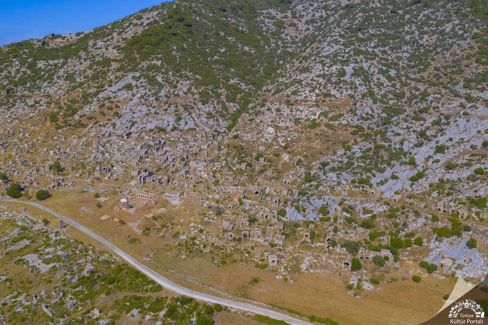 Toplam 1,5 kilometre uzunluğundaki surların inşasında yörenin mavi kireç taşı kullanılırken, Hellenistik Dönem’e ait gözetleme kulelerinde beyaz renkli taş kullanılmıştır. Odeon’un kuzeyinde yer alan tiyatronun yamaca dayalı oturma yerlerinden iz kalmazken çevre duvarlarının bir kısmı görülebilmektedir.